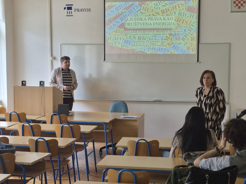 U utorak, 21. travnja 2026., na našem je Fakultetu, u sklopu Festivala znanosti 2026., zainteresiranim studentima i široj javnosti predstavljen znanstveni projekt „Suvremeni izazovi zaštite ljudskih prava – HRights“ (581-UNIOS-90). Projekt su, u ime istraživačkog tima, predstavili voditeljica projekta prof. dr. sc. Ivana Tucak, voditelj radnog paketa diseminacije izv. prof. dr. sc. Davor Muhvić te istraživač Ivica Pavić, mag. iur.