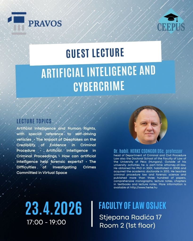 Pozivamo vas na gostujuće predavanje Artificial Intelligence and Cybercrime, koje će održati prof. dr. sc. Csongor Herke s Pravnog fakulteta Sveučilišta u Pečuhu koje će se održati 23. travnja 2026., 17:00 – 19:00 h, na Pravnom fakultetu Osijek, Stjepana Radića 17, dvorana 2 (1. kat).