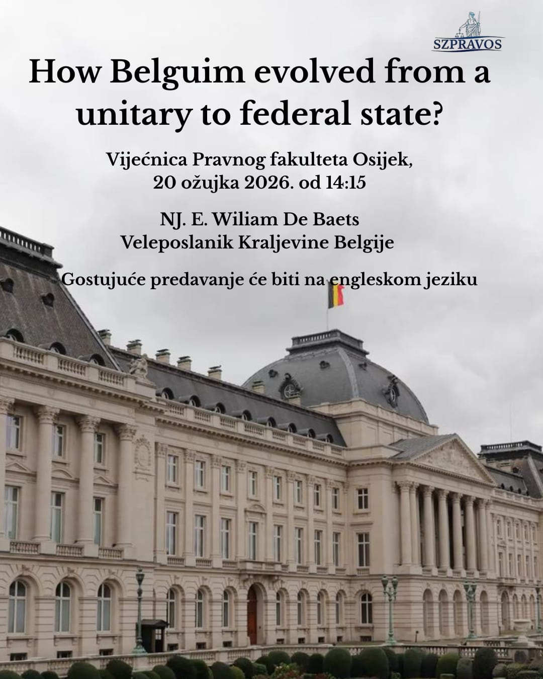 Na Pravnom fakultetu Osijek, u petak, 20. ožujka 2026. godine, veleposlanik Kraljevine Belgije, Nj. E. Williama De Baetsa, održat će gostujuće predavanje na temu „How Belgium evolved from a unitary to federal state?“
