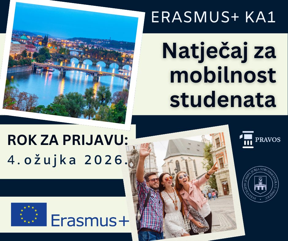 U okviru ERASMUS+ Programa – Ključne aktivnosti 1, Sveučilište Josipa Jurja Strossmayera u Osijeku objavilo je natječaj za dodjelu financijskih potpora studentima koji odlaze na inozemne visokoškolske ustanove ili organizacije. Svrha boravka u inozemstvu je studijski boravak ili stručna praksa ili kombinirani studijski boravak i stručna praksa ili kratkoročna (kombinirana) mobilnost.
