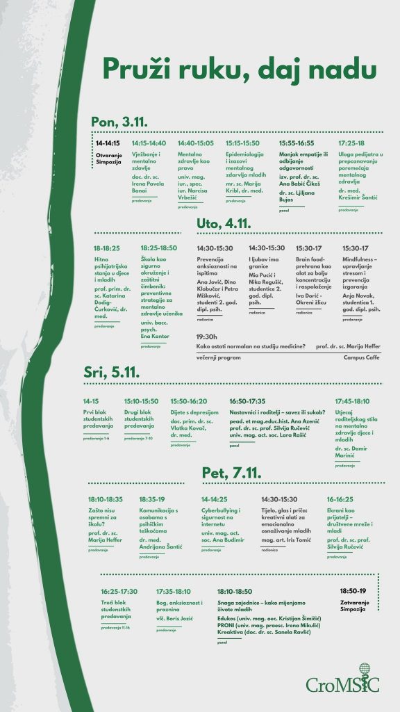 ovim putem Vas pozivamo na sudjelovanje na SIZOS 2025 – interdisciplinarnom simpoziju o mentalnom zdravlju djece i mladih, koji će se održati uživo na Filozofskom fakultetu u Osijeku od 3.11. – 7.11. u organizaciji studenata Medicinskog fakulteta Osijek, uz podršku odsjeka za psihologiju Filozofskog fakulteta u Osijeku i relevantnih institucija iz područja zdravstva, obrazovanja i društvenog djelovanja.