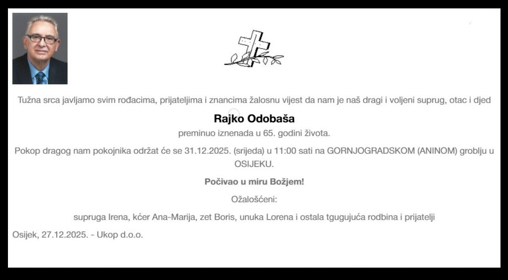 Posljednji ispraćaj prof. dr. sc. Rajka Odobaše održat će se u srijedu, 31. prosinca 2025. godine u 11:00 sati na Gornjogradskom (Aninom) groblju u Osijeku.
